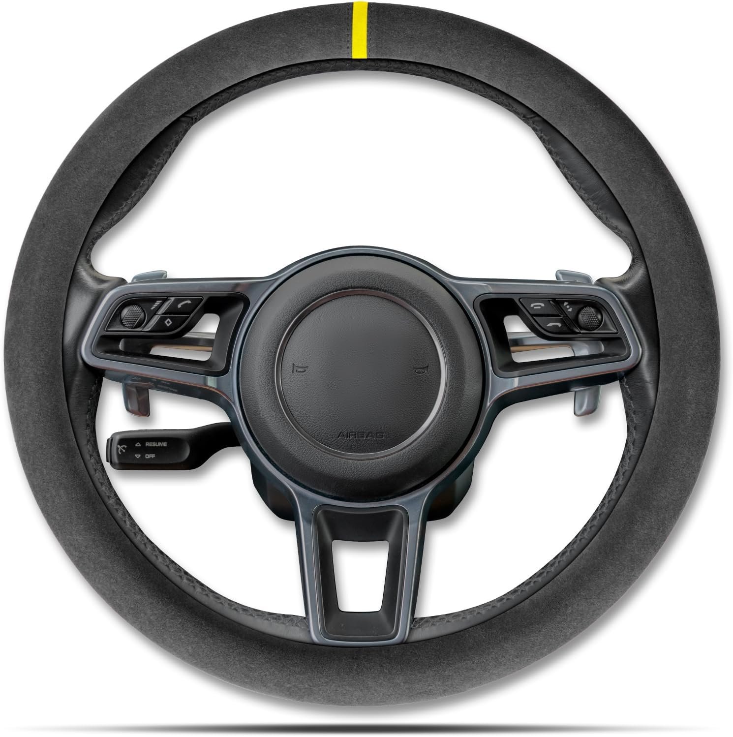 - Unique design: three styles and colors, this one is Black (Yellow Mark)-Regular Style, bring you a better visual experience. Beautiful and sturdy packaging to safely ship the steering wheel cover to you.